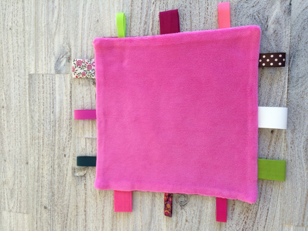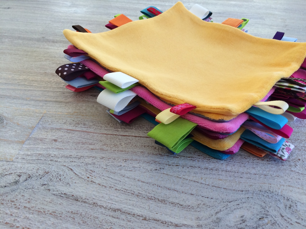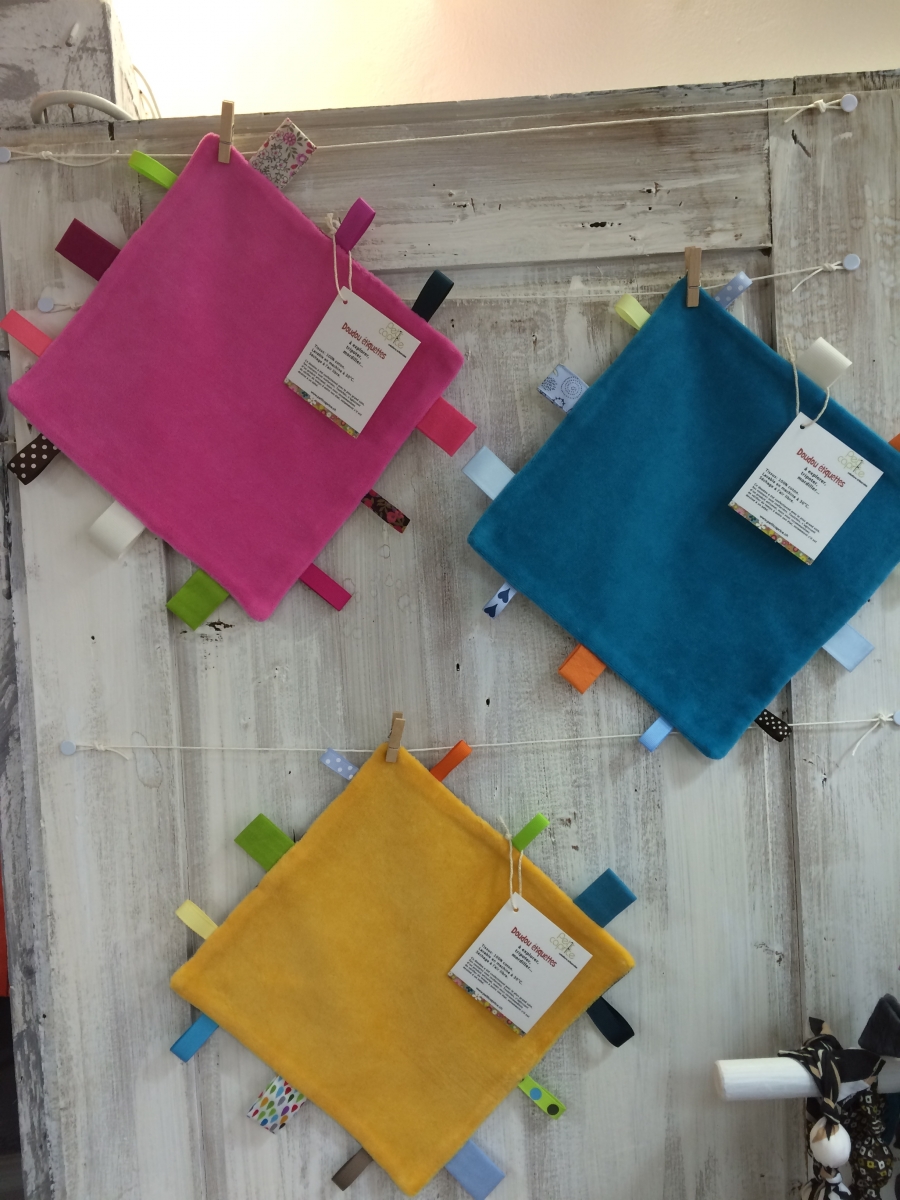 Des doudous tout doux, décorés de jolies étiquettes colorées de grandeurs et textures différentes.