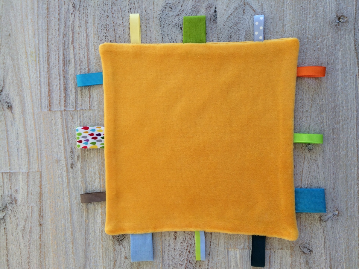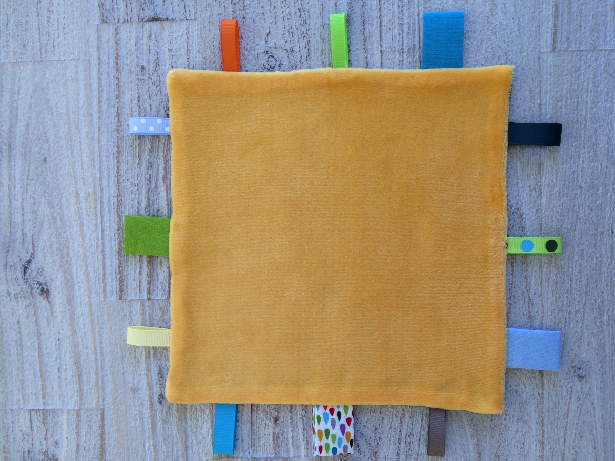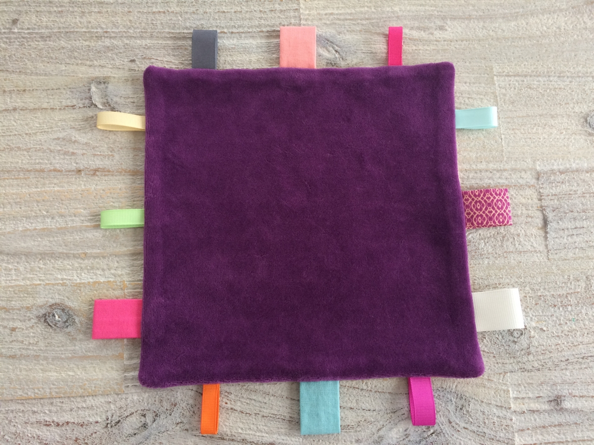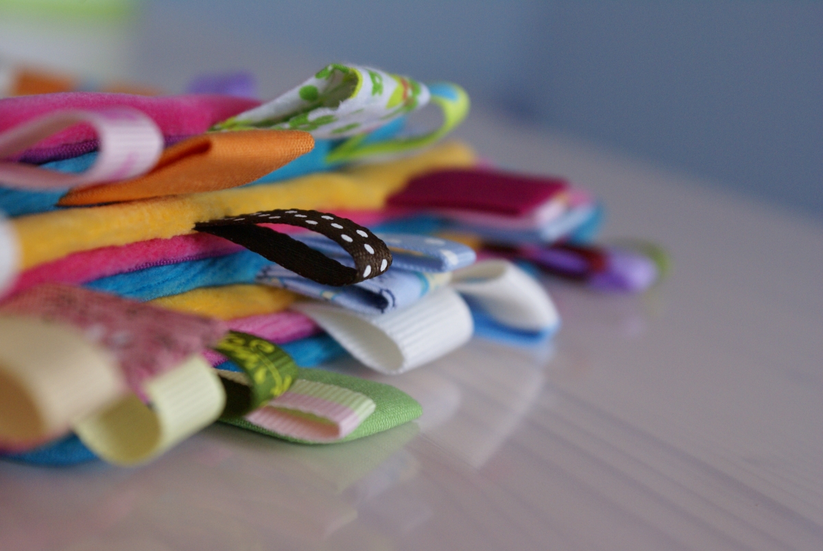 Des doudous tout doux, décorés de jolies étiquettes colorées de grandeurs et textures différentes.